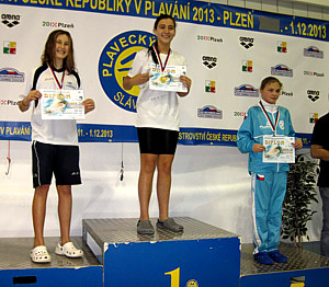 Pohár ČR 10 a 11 žactvaPlzeň - 7.-8.12.2013Pohár ČR 10-letých a 11-letých proběhl o víkendu 7.-8.12.2013 v Plzni. Z našeho oddílu se na tento závod nominovali Kristián Balon, Maruška Hnízdilová a Veronika Hrdá. Mezi desetiletými exceloval náš Kristián Balon, který dokázal vybojovat zlato hned v první své disciplíně a titul získal na 50m prsa v čase 38.90. K tomu pak dokázal přidat vynikající 2.místa na 50m volným způsobem, 100m polohový závod a 100m prsa. Sbírku pak ještě doplnil na trati 50m znak, kde získal bronzovou medaili. Mezi 11-letými plavci jsme měli hned dvě zastoupení. Maruška Hnízdilová odjížděla do Plzně s medailovými ambicemi a ty se jí podařilo naplnit. Ve své první disciplíně na 100m znak si s novým osobním rekordem 1:13.40 dokázala vyplavat titul mezi jedenáctiletými žačkami. Podobně se ji dařilo i na 200m znak, kde v samotném závodě dokázala odrazit atak dvou svých soupeřek a přidala do své sbírky druhou zlatou medaili. Na Pohár ČR 11-letých se také probojovala Veronika Hrdá a té se dařilo nejvíce na 100m prsa, kde obsadila 14.místo. Na 200m prsa pak ještě přidala 19.místo. Naši plavci dosáhli v Plzni skvělé výsledky. Získali 3 tituly, 3x stříbro a 1x bronz. Za předvedené výkony jim gratulujeme. Výsledky