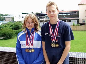 Mistrovství ČR staršího žactvaChomutov - 20.-21.6.2009Předposlední červnový víkend 20.-21.6.2009 se konalo v Chomutově Mistrovství ČR v plavání staršího žactva. Sešli se zde plavci z celé republiky ročníků 1996 a 1995. Obě kategorie plavali a byli i hodnoceny zvlášť. Z našeho oddílu se na tento vrcholný závod sezóny kvalifikovali hned tři plavci. David Urban v kategorii 1995, Lucie Urbanová a Kristýna Štrancová v kategorii 1996. Posledně jmenovaná Kristýna Štrancová se pravidelně zúčastňuje MČR a letos se ji podařilo splnit limit pro účast hned na 4 disciplíny. Nejlepšího svého umístění dosáhla na prsařské dvoustovce, kde časem 3:15.90 obsadila pěkné 16.místo. Ve zbylých závodech skončila na rozmezí první dvacítky a ze čtyř svých startů si třikrát zlepšila osobní rekord na 50-ti metrovém bazénu. Lucie Urbanová odjížděla na vrcholný závod sezóny s nadějí na zisk medaile. Její umístění v Chomutově, ale předčila všechna očekávání našich trenérů. Hned v prvním závodě se jí podařilo vysněnou medaili získat a to ji nastartovalo k dalším skvělým výkonům. Tím prvním závodem bylo 200m volným způsobem a Lucka v něm s přehledem vybojovala 2.místo v čase 2:18.82. Sobotní odpolední program začal závodem 50m volným způsobem. Vzhledem k tomu, že Lucka je spíše specialistkou na střední tratě než sprinterka, bylo její 3.místo velkým a příjemným překvapením. Hned po tomto úspěchu nastoupila Lucka na start dvousetmetrové "polohovky". Po prvním motýlkovém bazénu obracela na 2.místě, po znaku na 100 metrech držela 3.místo a na řadě byla prsařská padesátka. Zde k velkému překvapení držela krok s vedoucí dvojicí a díky tomu obracela do své nejlepší disciplíny, kraulu, stále na 3 příčce. V posledních 50 metrech kraula se pak děly věci. Lucka hned v prvních deseti metrech posledního bazénu smazala náskok Veroniky Vyčítalové z Kladna a soustředila se na útok na zatím vedoucí Kristýnu Holanovou z Berouna. Stupňujícím tempem metr po metru zkracovala náskok své soupeřky, aby se na ní v samém závěru dotáhla a mohutným finišem ji i o 0.35s předstihla! Lucka se tak za bouřlivé podpory tribun stala poprvé Mistryní ČR v plavání na trati 200PZ v čase 2:37.34. Po tomto skvělém výkonu absolvovala ještě 400m volným způsobem a protože ze sebe vydala v polohovce hodně sil, zbylo na ni v konečném účtování "jen" 5.místo. V neděli Lucie startovala nejprve na 200m znak a ač to měla být pro ni disciplína spíše na rozplavání dokázala se v ní naše závodnice prosadit a získala opět vynikající 2.místo v čase 2:39.57. Posledním závodem byla královská stovka. Lucie opět předvedla fantastický výkon a i když jen těsně prohrála souboj o 2.místo, je bronzová medaile za čas 1:03.21 jejím dalším velkým úspěchem. David Urban je již ostřílený borec a odjížděl do Chomutova s cílem přivézt alespoň jeden mistrovský titul a hned v prvním závodě, kterým bylo 200m volným způsobem, šel tvrdě za svým cílem. Po prvních sto metrech obracel s již skoro vteřinovým náskokem a jeho stále se zvyšující tempo nedokázal nikdo ze soupeřů zachytit. David dohmátl ve vynikajícím čase 2:04.81 a s náskokem více jak 1.5s před brněnským Jakubem Tobiášem a získal titul Mistra ČR. V následují disciplíně 400m volným způsobem, vše probíhalo jako závod na poloviční trati, jen s tím rozdílem, že kdo diktoval tempo, byl brněnský Tobiáš a marně ho stíhajícím, byl náš plavec. David nakonec musel ještě svést těžký souboj s dotírajícím třebíčským Vlčanem, ale náš plavec jeho útok nakonec odrazil a skončil na výborném 2.místě. V sobotním odpoledním programu David startoval nejprve na trati 50m volným způsobem. Skvělý start, precizní styl a mohutný finiš, to vše v podání Davida znamenalo zisk dalšího titulu Mistra ČR v čase 25.76. Následujících 100m znak bylo již jen na vyplavání a 6.místo v čase 1:08.40 bylo maximem po předchozích výkonech. Nedělní program začal David 200m znakem a jeho 4.místo mezi znakařskými specialisty bylo úspěchem. Ovšem Davidovi myšlenky již směřovaly ke kraulařské stovce. Těsně před jejím startem celá hala ztichla a očekávala velké finále na nejprestižnější kraulařské trati. Spolu se startovním povelem pak propuklo mohutné povzbuzování fanoušků za zvuků řehtaček a bubnu. David zvládl vypjatou atmosféru na jedničku a na startu neztratil ani setinu. Po prvních 50 metrech byla na čele skupina již jen tří plavců. Martin Rus z Jindřchova Hradce, Petr Tajčman z Jablonce a náš David Urban. Ve vedení byl na obrátce Martin Rus a jen těsně za ním Tajčman a Urban. Na 75 metrech se rozdíl smazal a do cíle se řítili všichni tři najednou. Již to vypadalo, že bude muset o pořadí rozhodovat elektronická časomíra, když náš borec předvedl, že je plavec té nejvyšší extratřídy. David nasadil na posledních zhruba 15 metrech tak drtivý finiš, že z vyrovnaného závodu udělal jednoznačnou záležitost. Z tribuny to vypadalo, jakoby jeho soupeři zastavili a on se řítil do cíle sám. Nakonec zvítězil o celou délku těla v čase 55.92 a s náskokem 1.36 vteřiny se stal potřetí Mistrem ČR! Naši plavci podali v Chomutově fantastické výkony. Kristýna Štrancová dosáhla svého nejlepšího umístění při svých účastech na MČR, když obsadila 16.místo na 200P. Lucie Urbanová získala celkem 5 medailí a vůbec poprvé se stala Mistryní České republiky. David Urban získal tři tituly Mistra ČR a jednou skončil na stříbrném stupínku. Výsledky